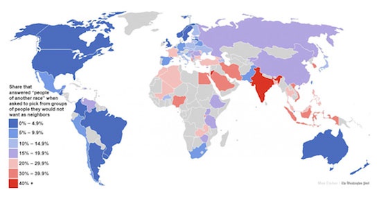 ¿A quién no querría tener como vecinos? Esta es la pregunta con la que World Values Survey quiso medir los países más y menos tolerantes con otras razas. Como muestra este mapa de The Washington Post, menos del 10% de los españoles entrevistados dijeron que no querían en su mismo edifico a personas de otras razas.