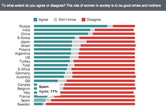 Solo uno de cada 10 entrevistados por Ipsos MORI dijo estar de acuerdo con que el papel de las mujeres en la sociedad es ser buenas madres y esposas, mucho menos que, por ejemplo, en Estados Unidos (36%) o la media de los países estudiados (34%).