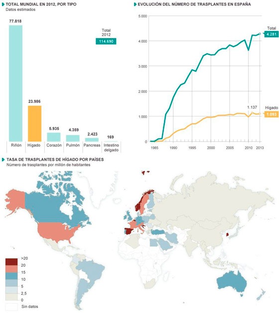 España es, desde hace más de dos décadas, el líder mundial indiscutible en trasplantes de órganos. En 2013 hubo 4.279 operaciones de 1.655 donantes, según los datos de la Organización Nacional de Trasplantes. La tasa española es de 35,3 trasplantes por cada millón de personas, muy superior a la de la Unión Europea (19,5) y la de Estados Unidos (25,8).