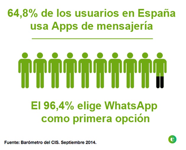 En España, el 64,8% de los usuarios utiliza alguna aplicación de mensajería en el móvil. Su uso está mas extendido que redes sociales como Facebook. WhatsApp es la aplicación favorita para el 96,4% de los usuarios de mensajería instantánea. El 60% de los usuarios tiene entre 11 y 100 contactos y el 0,4% tiene más de 500 contactos. Siete de cada diez lo utilizan para hablar con familiares y amigos, según los datos del último barómetro del CIS, publicado la semana pasada.