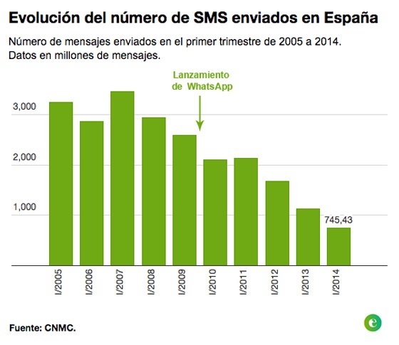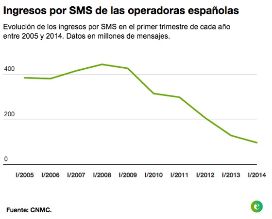 En este gráfico puedes ver la caída en el número de mensajes SMS enviados en España en los últimos años. En el primer trimestre de 2005 se enviaron 3.240 millones de SMS. En el mismo periodo de 2014 la cifra ha bajado hasta los 745 millones.