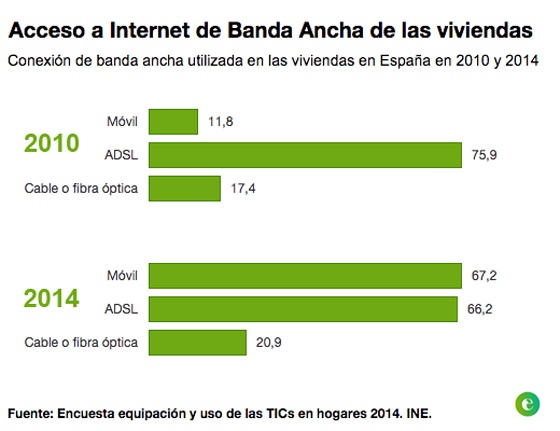 En este país han ocurrido dos fenómenos: es el país de Europa con mayor penetración de teléfonos smartphones, con un 66% de los usuarios de móvil, y este año, por primera vez en la historia, el móvil se ha convertido en la principal tipo de acceso a Internet, superado al ADSL y al cable o fibra. En este gráfico puedes ver cómo ha cambiado el tipo de conexión de banda ancha en las viviendas españolas entre 2010 y 2014.