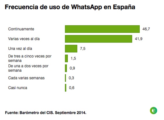 El uso que se hace en España de WhatsApp es intensivo. El 88,6% lo utiliza diariamente y de forma intensiva. Es minoría el usuario que tiene WhatsApp y lo mira cada pocos días o semanas. Si lo tienes lo utilizas sin parar.