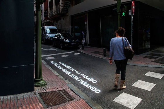Estas intervenciones están pensadas para que las vea el peatón y no llegan a invadir la calzada. El tamaño de la letra se adapta en cada caso al del espacio del paso de cebra.