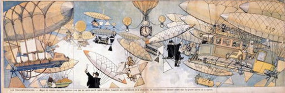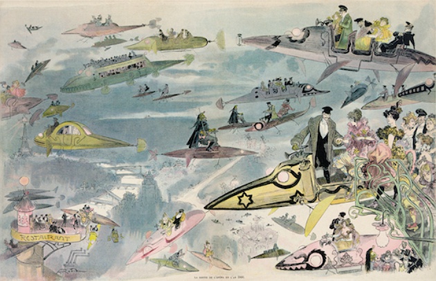 Esta ilustración de 1882 nos muestra cómo creía el artista Albert Robida que iríamos a la ópera en el año 2000. Se trata del mito por antonomasia del futuro: el coche volador, una de las muchas cosas que esperábamos de un porvenir tecnológico que no ha llegado.