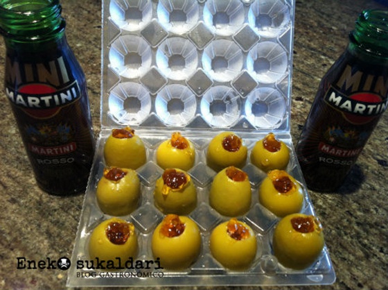 7. Dry martini ni agitado, ni mezclado... masticado. Con la aceituna dentro de la gelatina, con forma de cubito de hielo con sorpresa, o con la aceituna como molde. Así de apetitosa le queda al chef Falsarius la propuesta que tiene forma de cubito de hielo con sorpresa. Advertencia de su receta: "Cuanto más ricas sean las aceitunas, mejor". Será más fácil de desmoldar, dice también, si se usa un molde de silicona.