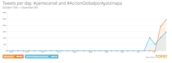 Toda esta movilización ha tenido su reflejo en las redes sociales. Desde la rueda de prensa de Murillo, y durante todo el día de ayer, hubo más de 430.000 tuits con el hashtag #YaMeCansé. También se ha utilizado de manera masiva #AccionGlobalporAyotzinapa. El vídeo con la rueda de prensa del procurador, que dura más de una hora, tiene más de un millón de reproducciones en Youtube y el momento en el que pronuncia el “Ya me cansé” tiene cientos de copias en vídeo y Vine. Las ilustraciones y las frases de protesta se comparten de manera masiva. Cada movilización se documenta en Facebook y Twitter. Porque México ya se cansó.