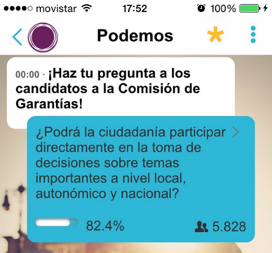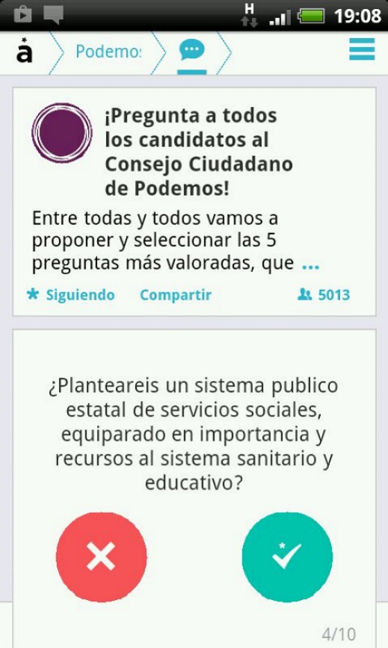 La primera versión de Appgree se utilizó, principalmente, para comentar la anterior edición de Gran Hermano. “Estuvimos cinco semanas funcionando durante la emisión del programa y conseguimos lanzar una pregunta a la vez a 90.000 personas y manejar sus respuestas”, explica Morán. Entonces, las preguntas que tenían que responder eran del tipo “¿Por qué razón nominarías a un concursante? ¿Debería estar dentro de la casa?”. En el congreso de Podemos, las preguntas tenían que ver con el modo de acabar con la corrupción o con el modelo educativo que defenderán si llegan al poder. Toda la gestión corrió a cuenta del equipo de la formación, que ya llevaba varios meses usando la aplicación: ellos se encargaban de plantear las preguntas a sus seguidores, sin ninguna intervención por parte de la empresa.