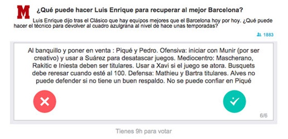 Además de la política, la aplicación también se utiliza en empresas, para recoger sugerencias y experiencias de empleados. Y para debatir sobre deporte: Marca.com utiliza su versión web para preguntar a los lectores su opinión sobre un partido. Aseguran que, cada día, entre 20.000 y 30.000 personas la utilizan, ya sea a través del teléfono o de la web. “Dentro de poco la creación de canales será más fácil, los podrán crear los usuarios directamente. Nos ha sorprendido mucho que funciona muy bien para grupos pequeños. Por ejemplo, para elegir una fecha y un lugar para una cena o el destino de un viaje de fin de curso”, cuenta Juan.