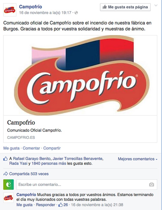 Las cuentas de Campofrío en Twitter y en Facebook se han convertido desde que el pasado domingo un incendio arrasara su fábrica en Burgos en un lugar para el intercambio de agradecimientos por parte de la compañía y buenos deseos de los usuarios.