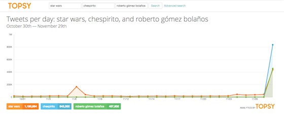 Tenía muchos nombres: Roberto Gómez Bolaños, Chespirito, Chavo del 8, Chapulín colorado. Y todos y cada uno de ellos ha ido apareciendo en la lista de trending topic en las últimas horas. La muerte del actor cómico mexicano ha generado miles de tuits desde que se conoció el viernes por la noche (hora española). Tantos que, incluso Topsy - la herramienta que mide los tuits - considera que en las últimas horas se han mandado más mensajes sobre el actor que sobre el otro gran acontecimiento del día de ayer en internet: el estreno del tráiler de la nueva película de Star Wars.