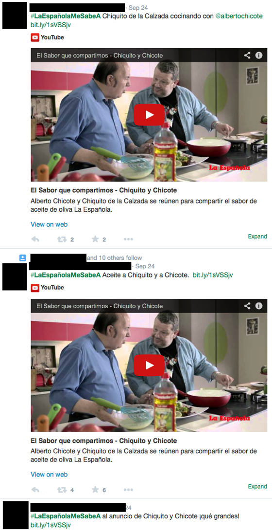 Aceites La Española es una de las empresas que reconoce haber puesto en marcha una de estas iniciativas a finales de septiembre. Para dar a conocer el nuevo anuncio de su aceite, pidió a varios tuiteros que usaran el hashtag #laespañolamesabea y después enlazaran al spot en Youtube. La empresa explica que escogieron esta vía "porque Twitter permite viralizar los mensajes de forma rápida y masiva, y esto es lo que buscábamos en los primeros días de nuestra campaña". Eso sí, también eran conscientes de que "en determinados momentos, el mensaje podía desligarse de la marca, lo cual era un riesgo que contemplamos desde el principio".