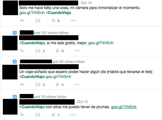 Es más, muchas veces estas campañas están inmersas en otras más amplias. Por ejemplo, Iberdrola lanzó en octubre Viaje hacia el calor, dirigida a fidelizar a sus clientes. La empresa explica que, entre otras acciones, llegó a "acuerdos puntuales con tuiteros y blogueros relacionados con los viajes". Estos tuiteros usaban el hashtag #CuandoViajo y enlazaban a un vídeo y a una web de específica de la promoción, ayudando a que "la gente siguiera hablando del tema". Pero otros clientes de Iberdrola utilizaron también el hashtag en Twitter porque era la forma de participar en sorteos para ganar viajes.