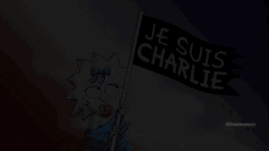 En su capítulo semanal en la cadena estadounidense Fox se ha emitido esta imagen de Maggie Simpson ondeando una bandera con el lema 'Je Suis Charlie', que recuerda a la escena La libertad guiando al pueblo del icónico lienzo de Delacroix y al cartel del musical de Los Miserables. El breve clip no fue acompañado de sonido alguno, según detalla la web Mediaite.