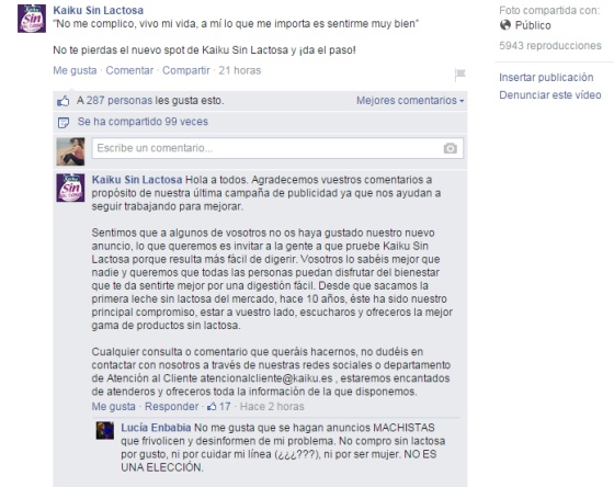 Toda publicidad alimentaria será mirada siempre con lupa al tratar con uno de los temas más sensibles y de mayor interés para la población. En 2011 otro anuncio de Kaiku ya generó cierta polémica precisamente por esa posible confusión en cuanto a si el target del anuncio son los intolerantes exclusivamente o todo tipo de consumidores: “Desde mi punto de vista (no sé si pensarás lo mismo), el anuncio de Kaiku sin lactosa insinúa que la lactosa es poco menos que perjudicial y por ello debemos eliminarla de la dieta”, dice el autor del blog Gominolas de Petróleo. En esta ocasión la marca está respondiendo desde las redes sociales y su correo electrónico.