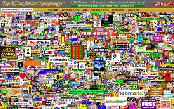 ¿Y por qué comprar un espacio publicitario carísimo en televisión? ¿Por qué no comprar espacio en una web? Un estudiante inglés decidió vender espacio en su web, llamada La página del millón de dólares. Cada píxel costaba un dólar. Por increíble que os parezca, el estudiante logró vender un millón de píxeles. La página web sigue operativa y con este aspecto: