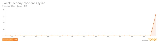 La fiesta electoral para los seguidores de Syriza comenzó en la la céntrica plaza de Klafzmonos de Atenas. A una caseta, convertida en cuartel general del partido izquierdista, comenzaron a llegar simpatizantes hasta que el espacio no dio más de sí y un exultante Tsipras tuvo que trasladarse a un estrado en la Universidad de la capital griega para dar su discurso final. Pasó algo más de una hora hasta que el escrutinio confirmó los 149 escaños que otorgaban la victoria definitiva. Mientras tanto, los asistentes se entretuvieron con la banda sonora que un DJ había preparado para amenizar la velada. Una playlist que muchos de los periodistas y políticos españoles allí presentes compartieron en las redes sociales. Según la herramienta de medición Topsy, solo en español hubo más de 1.400 tuits sobre las canciones de Syriza.