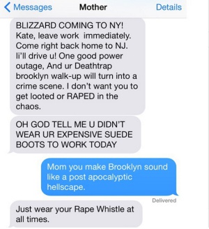 Ellas lo viven todo con mucha intensidad. Y una tormenta como Juno les da el pretexto perfecto para sacar toda la angustia que llevan dentro. La popular cuenta de Instagram Crazy Jewish Mom, que parodia las conversaciones entre una madre histérica y su estoica y paciente hija, ha estado echando humo con motivo de la tormenta.