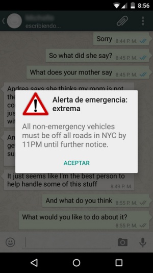 Alrededor de las 23:00 del lunes, todos los teléfonos móviles de las personas que viven en mi apartamento en Brooklyn comenzaron a sonar al unísono con un tono chillón que nadie había oído hasta el momento. Era una alerta de los servicios de emergencia prohibiendo la circulación del tráfico durante toda la noche. Mi compañera de piso Emmeline Cardozo me explica que todos los teléfonos reciben este tipo de notificaciones en caso de desastre natural. "La víspera del huracán Sandy fue una locura. Estaba cenando en un restaurante en Brooklyn, éramos unas treinta personas. Todos los móviles empezaron a sonar y no había manera de silenciarlos", cuenta.