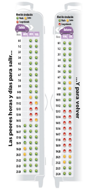 Además de la información sobre el tráfico que la DGT ofrece en su web y en Twitter, la entidad ha publicado los tiempos de trayecto previstos dependiendo de la hora de salida, estimados según los datos de tráfico del año pasado y para las autopistas con salida desde Madrid.