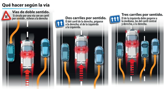 Tal y como recoge la DGT en su revista, si nos encontramos con un vehículo de emergencia, como ambulancias, coches de bomberos y policía, hemos de evitar entorpecer su camino. En una vía de doble sentido, debemos echarnos a la derecha lo más que podamos; en una de dos carriles por sentido, debemos pegarnos a la derecha si vamos por la derecha y a la izquierda si vamos por la izquierda; si hay tres carriles, el que circule por la izquierda debe pegarse a la mediana y el resto, lo más a la derecha que sea posible.