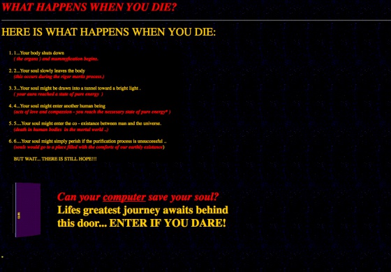 10.- El viaje cósmico de heaven.internetarchaeology.org no dejará a nadie indiferente. La puerta que se abre en la parte inferior izquierda conducirá al lector al más allá de los peores recursos digitales. El cielo como un despiporre de gallos guitarristas, angelitos bailongos y astronautas. Todos esos recursos de lowfi que logran despertarnos ternura.
