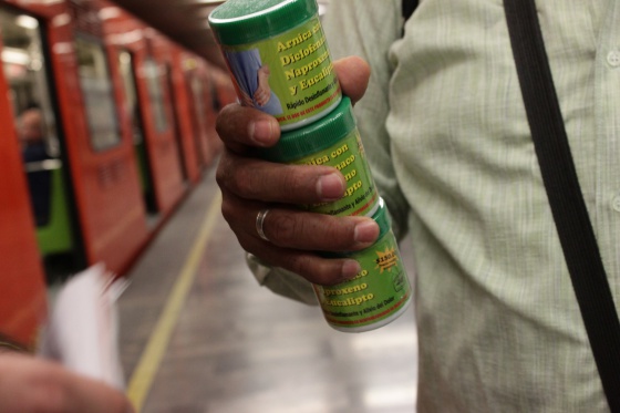 7. La farmacia ambulante: Ferrá, el de los 40 años de oficio como vendedor-topo, cuenta que ha pasado por postales navideñas, plumas, kits "de lo que sea" y ahorita ha decidido que el producto clave son las cremas de árnica, que lo mismo sirven "para golpes, que para torceduras que para inflamaciones".