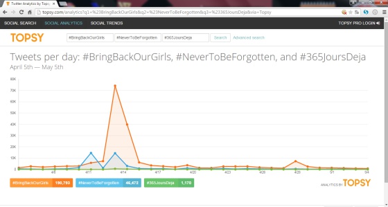 El primer aniversario del secuestro, el pasado 14 de abril, fue la ocasión para demostrar que la preocupación por las niñas secuestradas no había sido un espejismo. Más de setenta mil mensajes se compartieron esa jornada en todo el mundo usando el hashtag bandera. Pero también puso de manifiesto la aparición de algunas etiquetas derivadas como #NeverToBeForgotten o #365JoursDeja, en la esfera francófona.