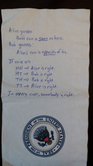 Como avance, un ejemplo de una estrategia que no funciona: Alice y Bob deciden de entrada que los dos dirán que el otro ha sacado cara. Esta estrategia no garantiza ganar, porque los dos sacarán cruz un 25% de las veces y ambos vaticinios serían incorrectos. Ganarán un 75% de las veces, pero eso no basta: tienen que ganar siempre.