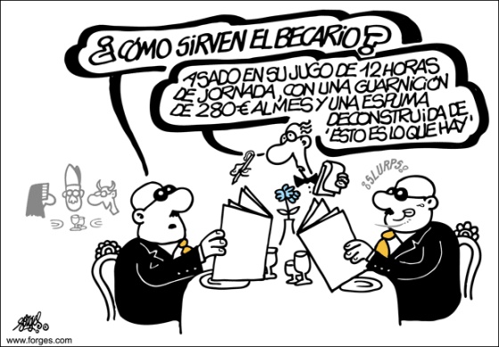 Forges, que ha trabajado con muchos becarios aunque no los ha tenido a su cargo, dice tenerles mucho respeto: "Si te das cuenta, en la mayoría de mis viñetas sobre el tema intento que el becario sea el bueno y, el contratante, el menos bueno". Seguro que los que han sido becarios alguna vez se sienten identificados en alguna de estas situaciones que tienen un poco de humor y mucho de realidad. Quizás por eso hay viñetas de Forges sobre becarios colgadas en muchas oficinas españolas.