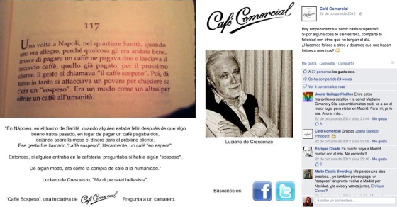 En plena crisis, en octubre de 2012 el Comercial decidió impulsar esta tradición en España, anunciándolo así en su cuenta de Facebook: "Hoy empezaremos a servir cafés sospesos!!! Si por alguna cosa te sientes feliz, comparte tu felicidad con otros que no tengan el día. ¿Hacemos felices a otros y dejamos que nos hagan felices a nosotros?". Y explicaban la tradición con esta cita del escritor italiano Luciano de Crescenzo: