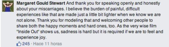 "Gracias por hablar abierta y honestamente acerca de tus abortos. Creo que la carga de dolor y las experiencias difíciles como esas se hacen un poco más llevaderas cuando sabemos que no estamos solos. Gracias por darle forma a eso e invitar a otras personas a compartir tanto los momentos felices como los duros. Como nos muestra la sabía película 'Del revés', la tristeza es dura pero necesaria si queremos sentir y experimentar alegría." Margaret Gould Stewart