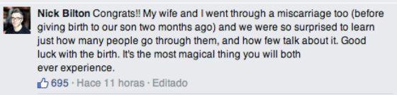 "¡Enhorabuena! Mi mujer y yo también sufrimos un aborto ( antes de tener a nuestro hijo hace dos meses) y nos sorprendió mucho la cantidad de gente que lo sufre y los pocos que hablan sobre ello. ¡Buena suerte con el nacimiento! Es lo más mágico que os va a pasar a los dos" Nick Bilton