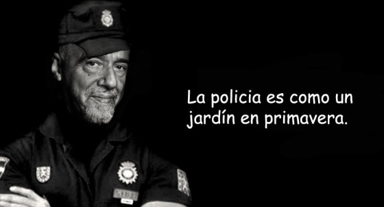 Como ejemplo de los contenidos que ofrecería a los seguidores de la policía, Boatella nos ofrece dos de sus montajes. El primero, que ya ha usado en alguna ocasión, nos recuerda el alegre trabajo de los antidisturbios, y el segundo nos propone una frase para reflexionar. Se nota que es para reflexionar porque sale Paulo Coelho y está escrita en comic sans.