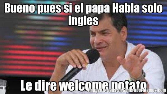 El juego de palabras también se popularizó en julio de 2015, durante la visita del papa Francisco a Ecuador, como se ve en esta imagen en la que aparece el presidente del país, Rafael Correa. Ya había circulado en en esta web satírica ecuatoriana, en una publicación de 2012, cuando el papa era el alemán Benedicto XVI.