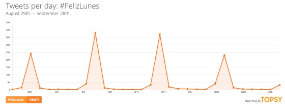 Si nos vamos a Topsy, podemos ver que el hashtag lleva unos 3.500 tuits a las diez y media de la mañana, y que el último mes ha sumado casi 150.000 tuits. Cada lunes, la etiqueta se lleva entre 25.000 y 40.000 mensajes que nos desean un buen día o se lamentan del inicio de la semana laboral.