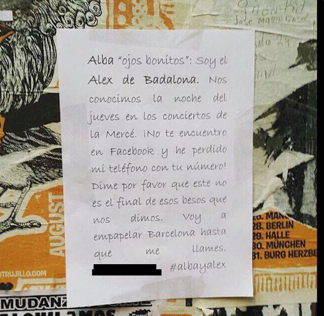 En los dos últimos días, las redes sociales han estado pendientes de una historia de amor tan romántica que parecía de cuento. En unos carteles colgados por distintas calles de Barcelona, Álex buscaba a Alba, una chica de ojos bonitos a la que, supuestamente, había conocido durante las fiestas de la Mercé (que fueron la semana pasada). Se habían dado algunos besos, él había perdido el teléfono con su número y ahora estaba dispuesto a empapelar toda la ciudad hasta dar con ella. Una historia de chico busca a chica, un amor imposible y el hashtag que acompañaba la nota -#AlbayAlex- eran los ingredientes necesarios para animar a todo internet a buscar a la chica. Solo que la historia no era cierta: él no es Álex, sino Damián, y no es de Badalona, sino un escritor y trabajador social uruguayo que vive en Barcelona.