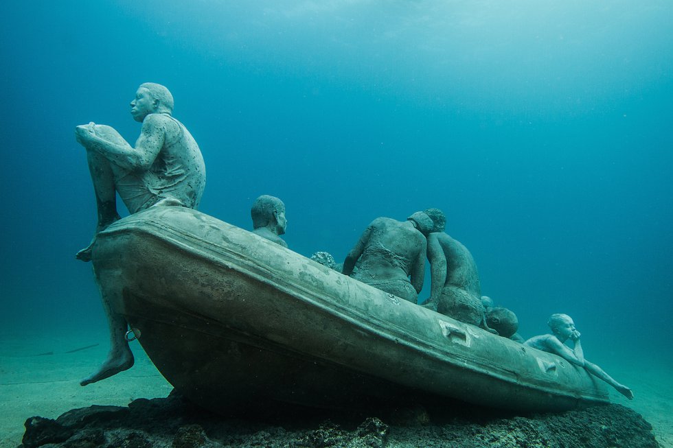 Taylor, instalado con su familia en Lanzarote, lleva dos años de trabajo previo en la superficie. Mientras llegaban los permisos para utilizar el suelo marino, las obras iban tomando forma en su taller. Entre esos conjuntos escultóricos que ya se ha sumergido se encuentra ‘La balsa de Lampedusa’ - un homenaje a los refugiados que huyen de sus países a través del mar - o El Rubicón, figuras humanas que invitan a reflexionar sobre el comportamiento de los turistas o el uso de las nuevas tecnologías.