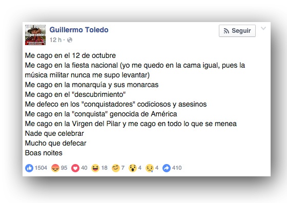 Willy Toledo ha sido el primero en arremeter contra el 12 de Octubre desde su perfil de Facebook. En un post publicado la noche del domingo enumeraba las razones que le llevan a pensar que no debe ser un día de celebración. Las opiniones del actor suelen ser motivo de gran controversia y su publicación está generando comentarios muy divididos.
