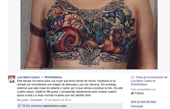 Las imágenes en las que los efectos de una mastectomía son evidentes no siempre pasan los filtros de control de las redes sociales. En 2013 esta publicación en la que se mostraba el torso de una mujer tatuada fue retirada por Facebook después que su contenido fuera denunciado por inadecuado. Otros usuarios de la red social la recuperaron porque consideraban que la lucha contra el cáncer debía visibilizarse y no ocultarse.