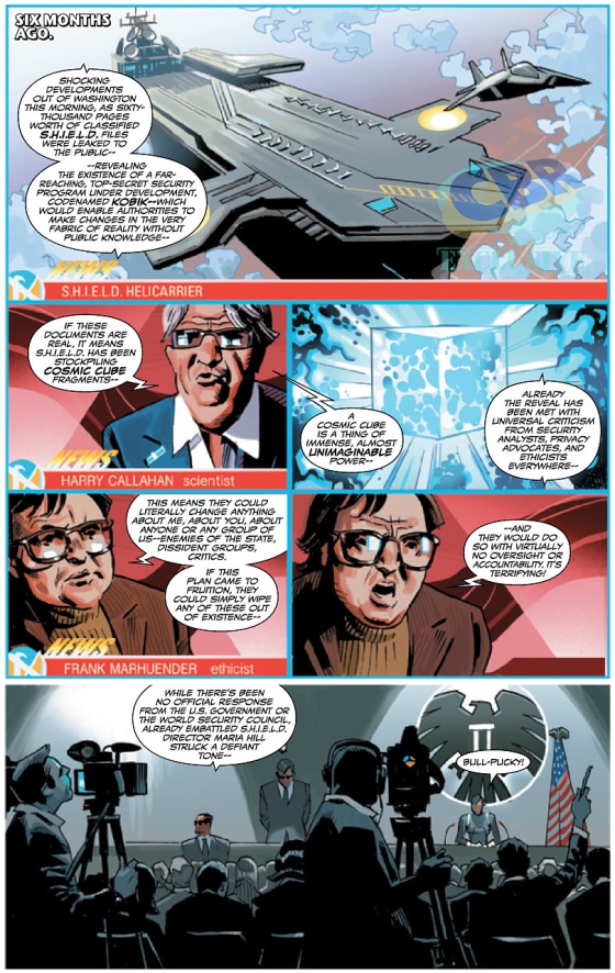 En el primer número el héroe afroamericano se enfrentó a una Sociedad de la Serpiente neonazi que trata de evitar que los mexicanos crucen la frontera estadounidense. El Capitán América, defensor de los valores universales, era tachado de supercomunista en las viñetas. En la vida real Fox News se ha puesto en su contra por que su “héroe favorito” se enfrentara a “los que defienden la ley”. En el segundo número, el guionista Nick Spencer lo enfrenta a un drama moral similar al de Wikileaks o las filtraciones de Edward Snowden. Tanto Marhuender como el Capitán defienden la veracidad de esos papeles y los errores de la agencia de espionaje SHIELD. Un reflejo de la realidad que no había sido tan claro desde que Steve Englehart dejó entrever que el presidente Richard Nixon era el verdadero villano a la sombra de una peligrosa conspiración.