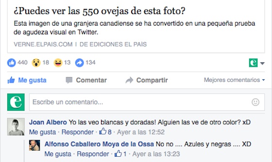 Por cierto, el vestido sigue siendo una referencia que entiende casi todo el mundo cuando hablamos de asuntos de colores e ilusiones ópticas. Por ejemplo, cuando el pasado martes publicamos la fotografía de las 550 ovejas (que ni siquiera era una ilusión, solo una foto simpática), uno de los primeros comentarios en la página de Facebook de El País fue, cómo no, que veía a las ovejas blancas y doradas. Otro lector le contestó que ni hablar, que eran azules y negras. Yo sigo pensando que no eran ovejas, sino llamas.