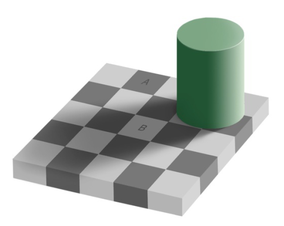 No sólo influye la luz, sino también la comparación con el entorno, como ocurre por ejemplo con la conocida ilusión de Adelson. Da igual que sepamos que los cuadros A y B sean del mismo tono de gris: no hay forma de que nuestro cerebro los vea iguales.