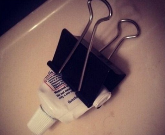 Hace un momento hablábamos de llevar útiles de cuarto de baño (los restos, al menos) al escritorio y ahora hacemos a la inversa: un clip de pinza grande y resistente te permitirá apurar la pasta de dientes. Una cosa es enrollar bien el tubo y otra cosa asegurarte de que ni la más mínima pizca de pasta dentrífica se desperdicia. Con este truco tienes el ahorro garantizado.
