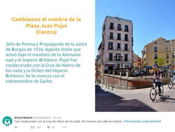 Ahora Madrid ha ido enumerando en su cuenta de Twitter las calles afectadas, explicando los motivos del cambio. Sin embargo, al llegar a la dedicada a Juan Pujol Martínez se han liado: como se puede ver en este pantallazo de un tuit que posteriormente borraron, mezclan la biografía de Juan Pujol Martínez, franquista, con la Juan Pujol García, héroe de la Segunda Guerra Mundial.