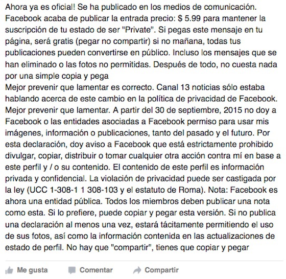 Lo que se contaba: a finales de septiembre una publicación en inglés alertaba de que Facebook pasaría a ser de pago y haría públicos todos los mensajes de los usuarios a menos que compartieran el post. Semanas después, llegó a España.