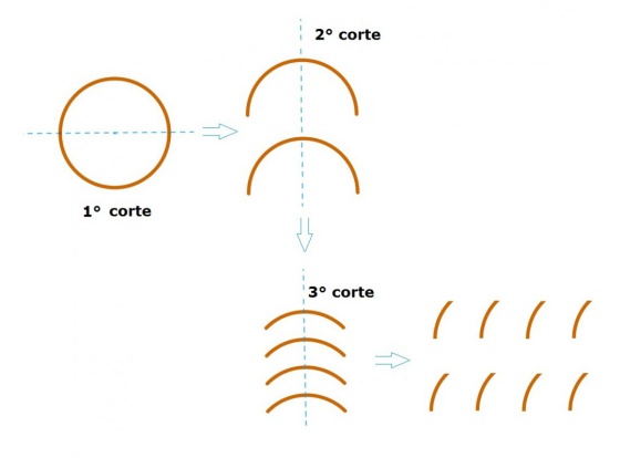 - Con un nuevo y único corte, cortamos estas dos mitades en cuatro cuartos de roscón que superponemos con mucho cuidado en una torre que procedemos a cortar nuevamente en ocho trozos. Teóricamente, este procedimiento proporcionaría dos elevado a n trozos de roscón con solo n cortes (8 trozos con 3 cortes, 16 trozos con 4 cortes, 32 trozos con 5 cortes...)