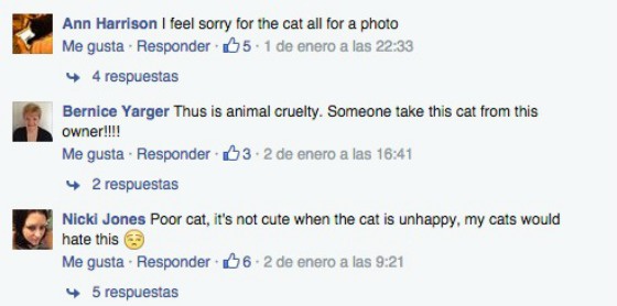 En Facebook otros usuarios indignados reaccionaba con un "Me da pena del gato. Todo por una foto", "Esto es crueldad animal. ¡¡¡Alguien debería quitarle el gato a su dueño!!!" o "Pobre gato, no es bonito cuando el gato no está feliz. Mis gatos odiarían esto".