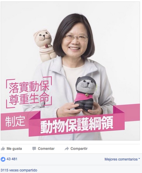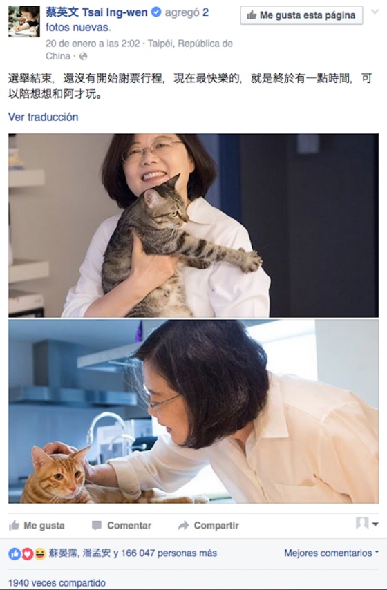 La página oficial de Tsai Ing-wen en Facebook ha sido el canal por el que la futura presidenta se ha comunicado con la audiencia taiwanesa. Sus casi dos millones de seguidores han sido testigos de las vivencias de sus gatos y su forma de hacer política a través de su portal en la web de Mark Zuckerberg.