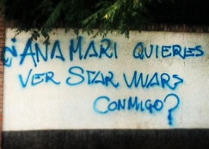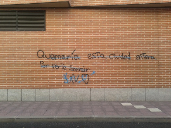 Hay un buen montón de pintadas de amor, entre otras muchas otras, en el blog Caligrafias urbanas, de donde hemos sacado este bello ejemplo. ¡Ah, Nerón! ¡Siempre fuiste un incomprendido! Esta pintada la vemos con una sonrisa, y en cambio a Nerón lo crucificamos por prácticamente lo mismo. Doble moral.